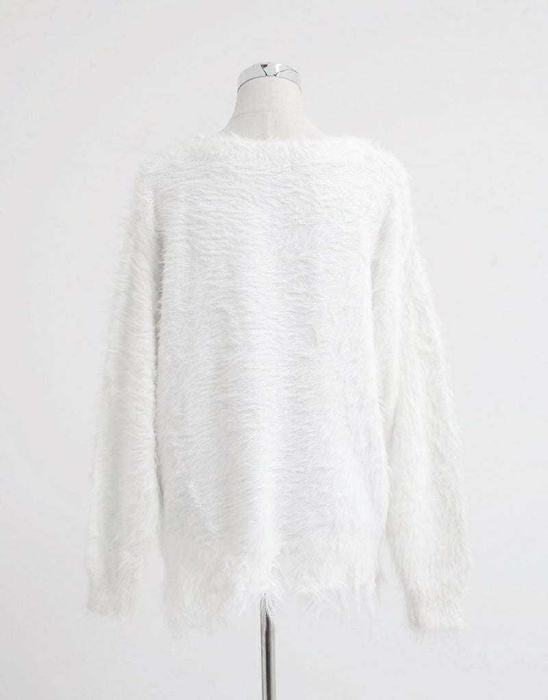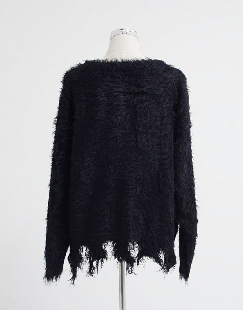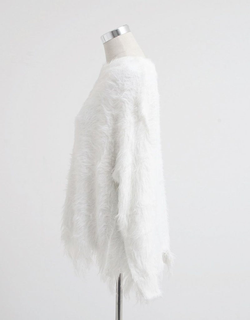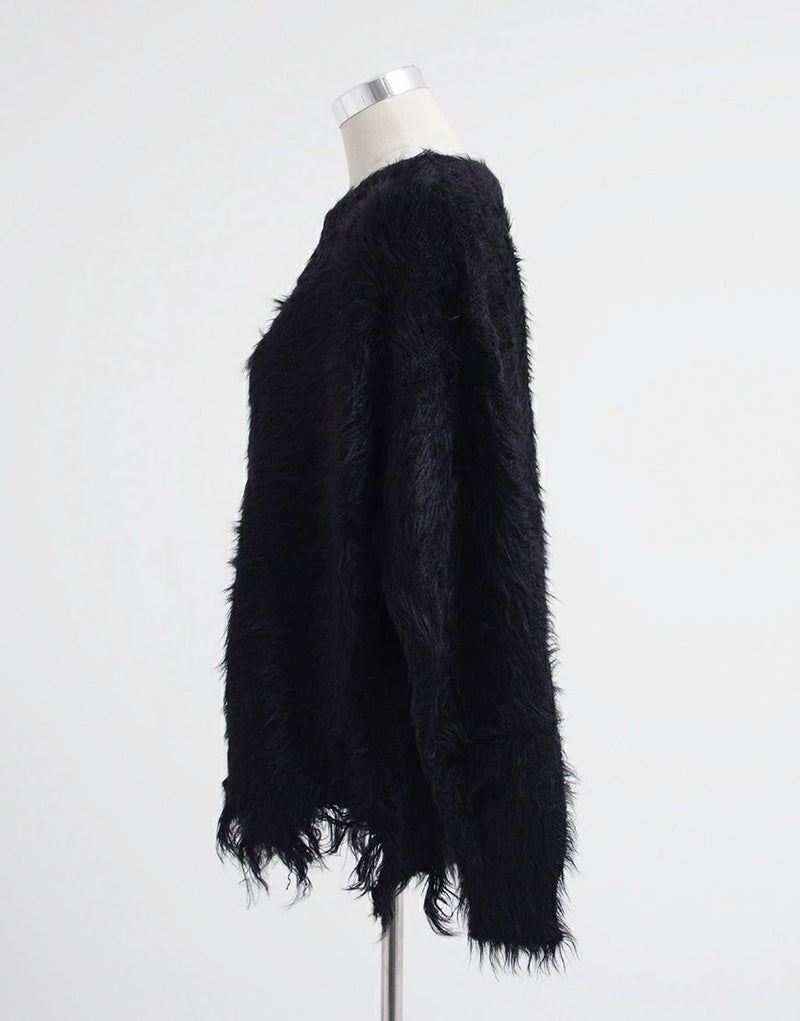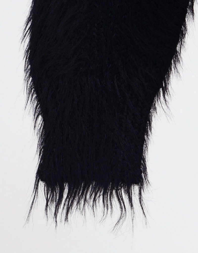 長い毛足が特徴のフェザーヤーンを使用し、動くたびに揺れる質感が存在感のある一枚に仕上がっています。