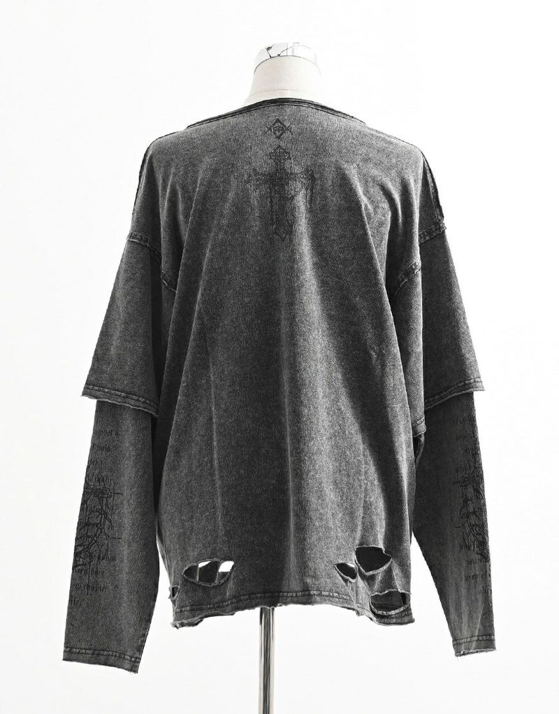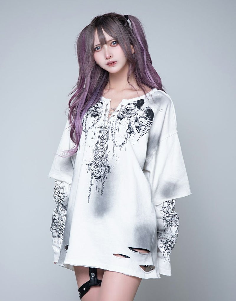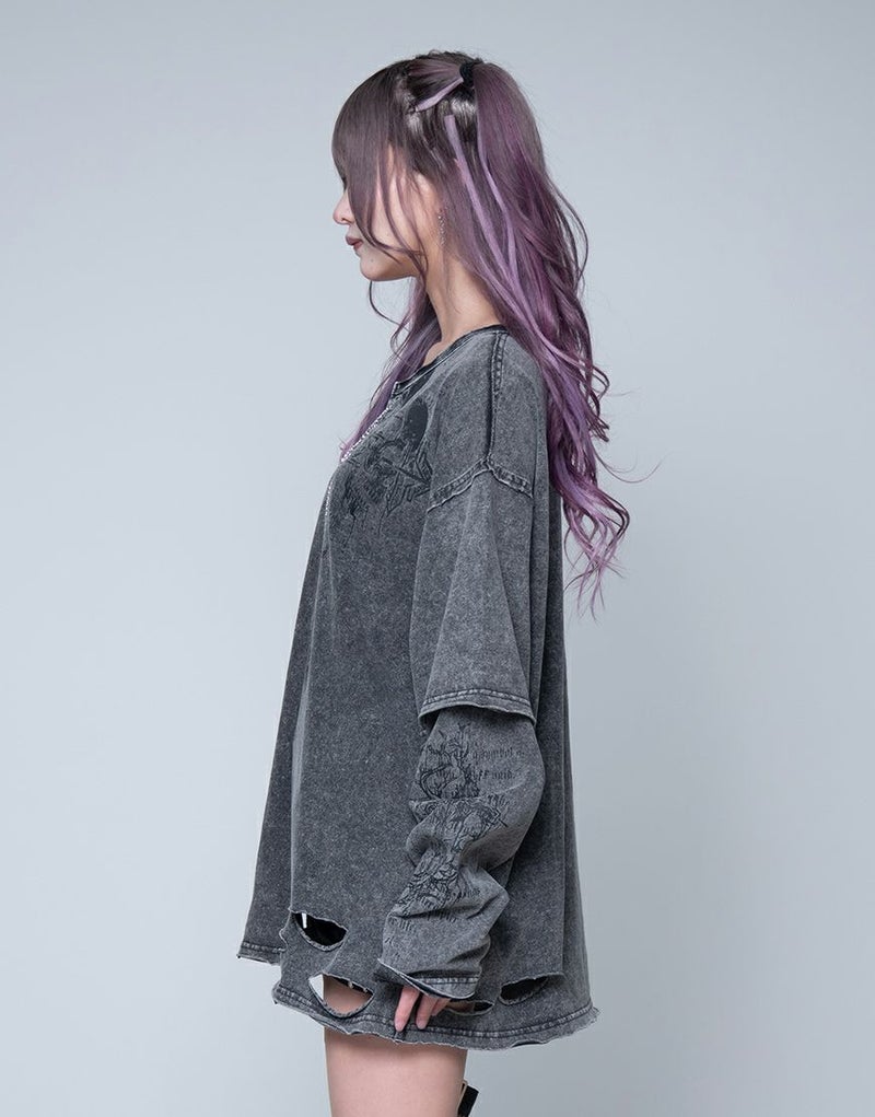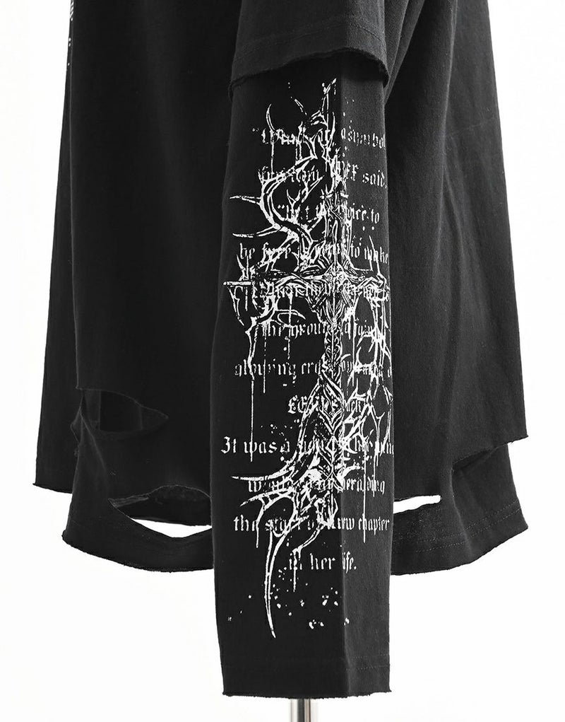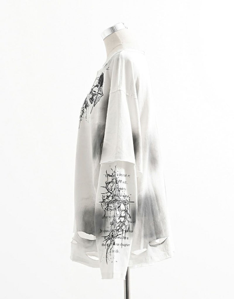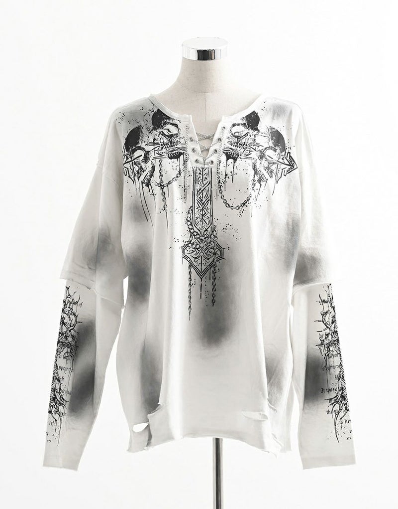 滲みや掠れを効かせたプリント表現が、グランジ感とダークな世界観を際立たせます。