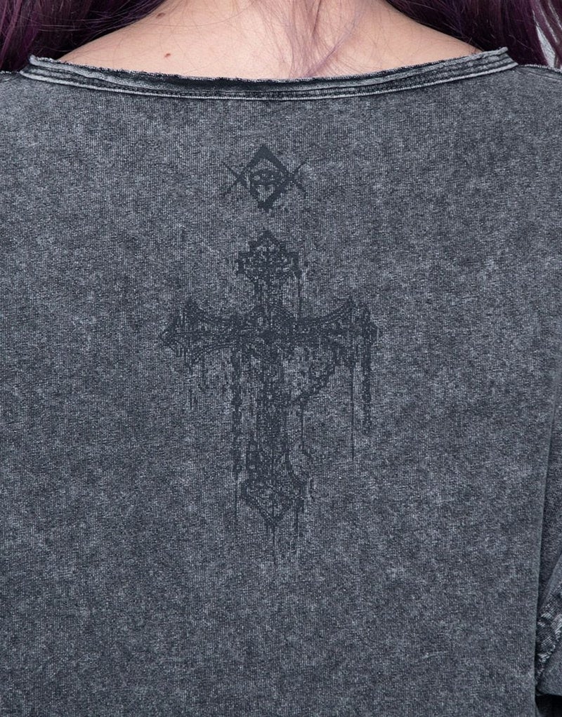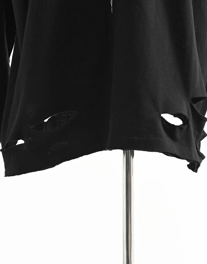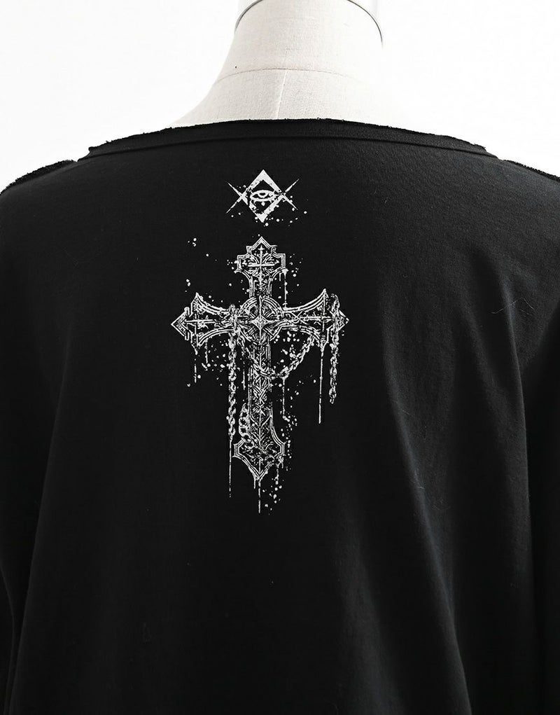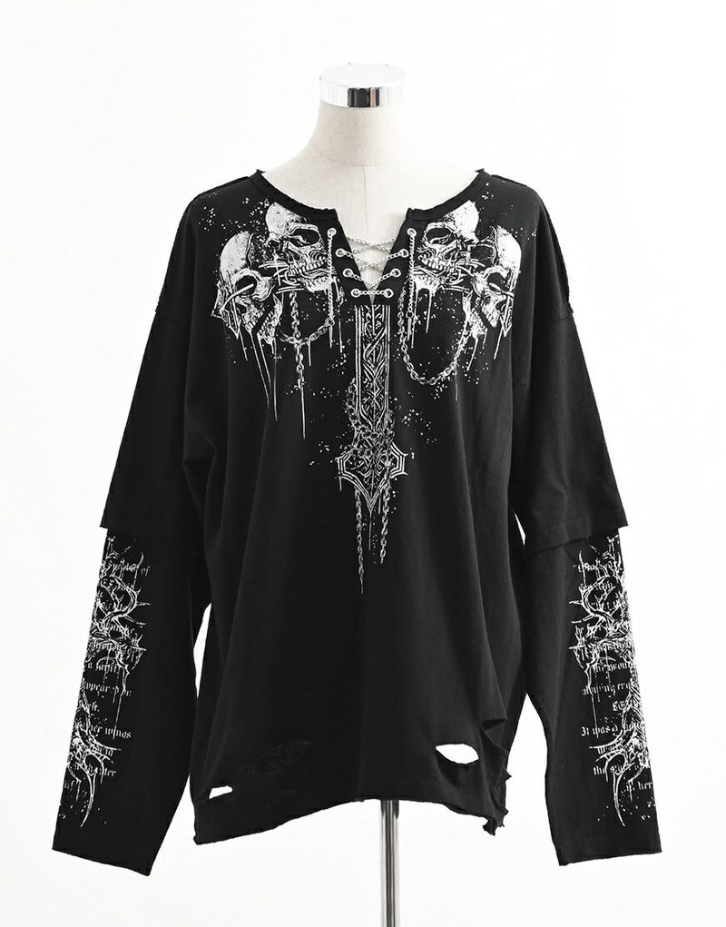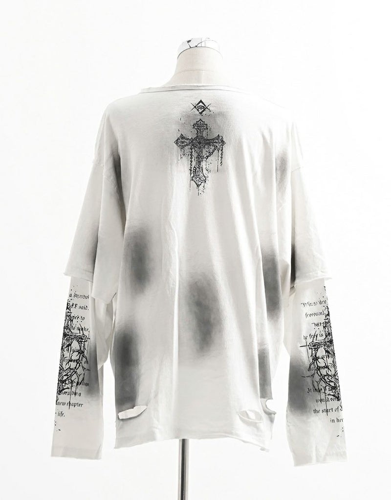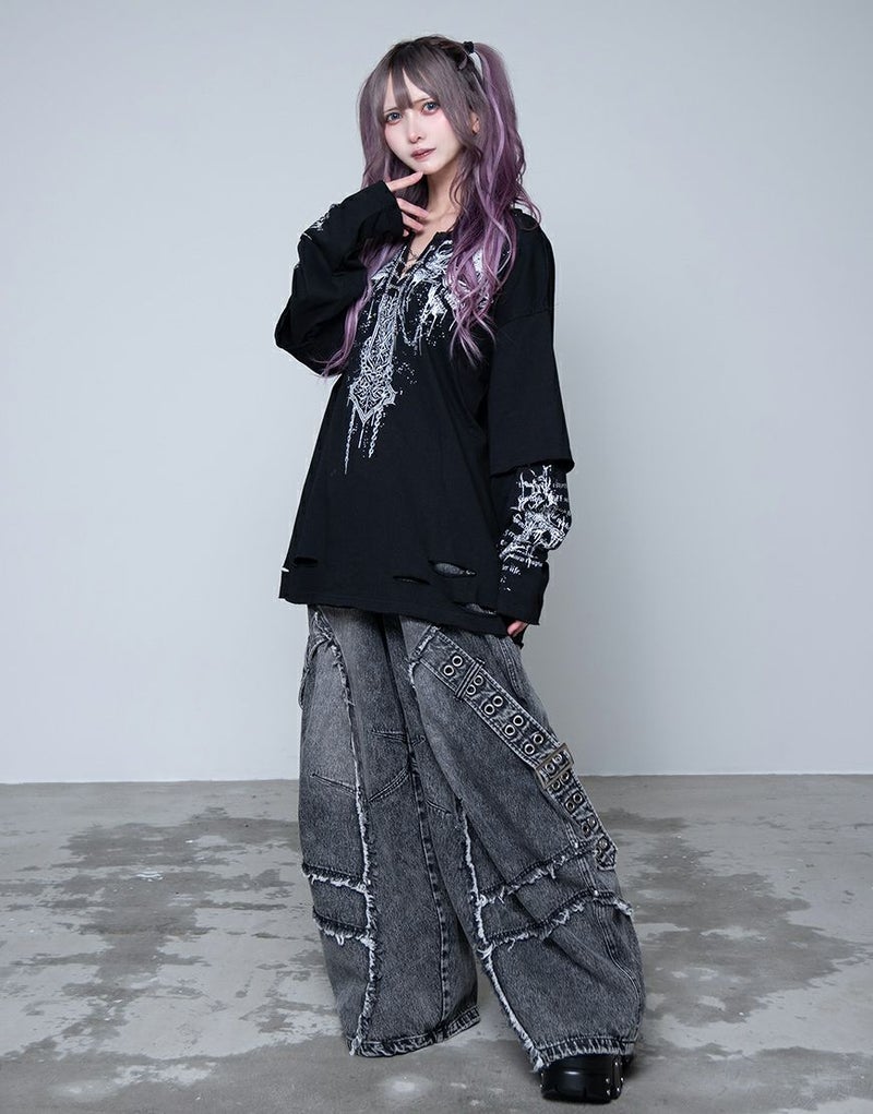 滲みや掠れを効かせたプリント表現が、グランジ感とダークな世界観を際立たせます。