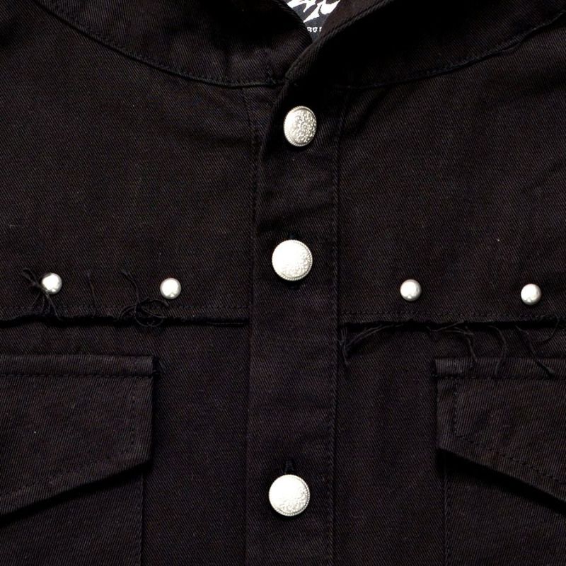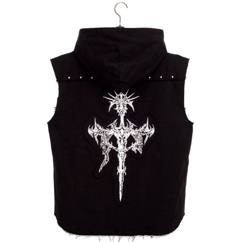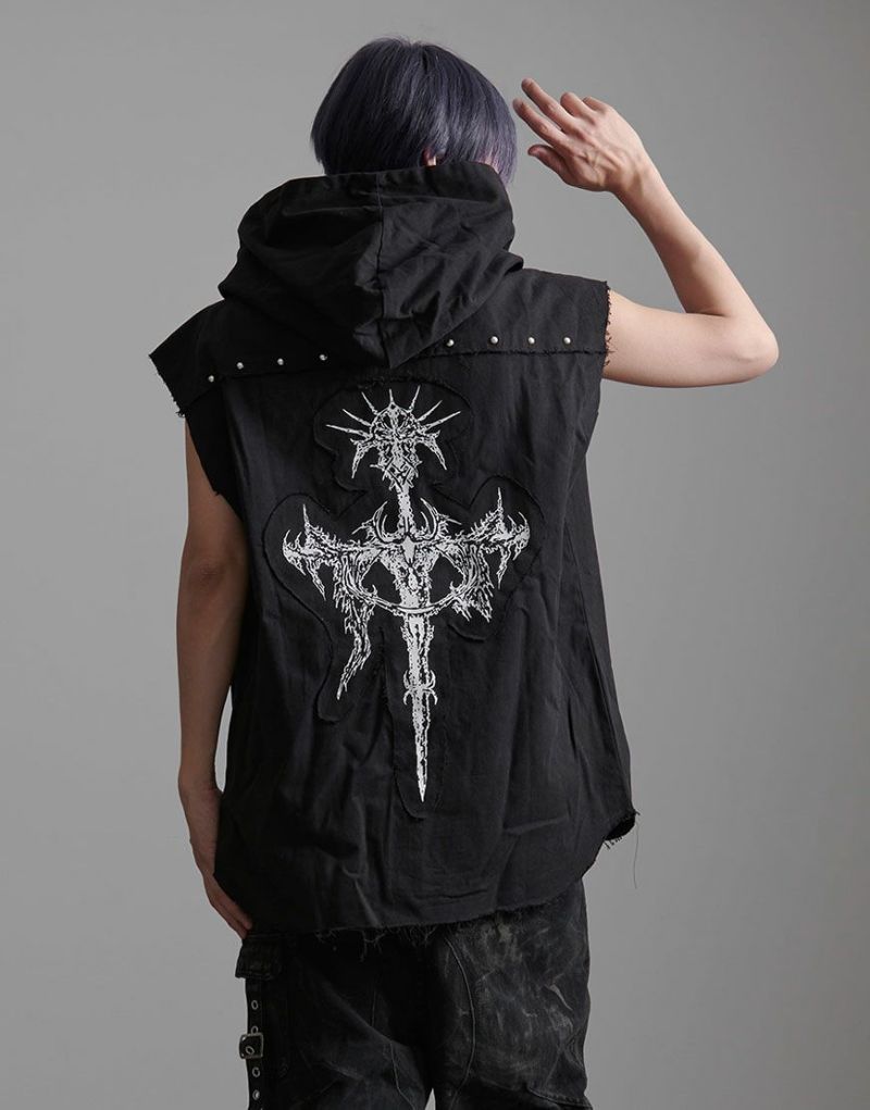 大胆に施されたスタッズデザインと背面のクロス・モチーフの貼り付けデザインが目を惹くアイテムです。