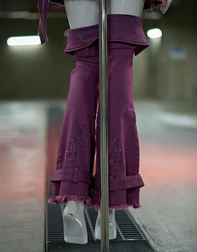 目を惹くレースアップデザインに前後にポイントでクロスパッチを配置。裾はカットオフ仕様で履き口のベルトは縛ってサイズ調節可能となっています。