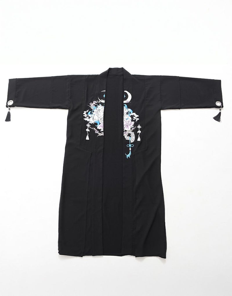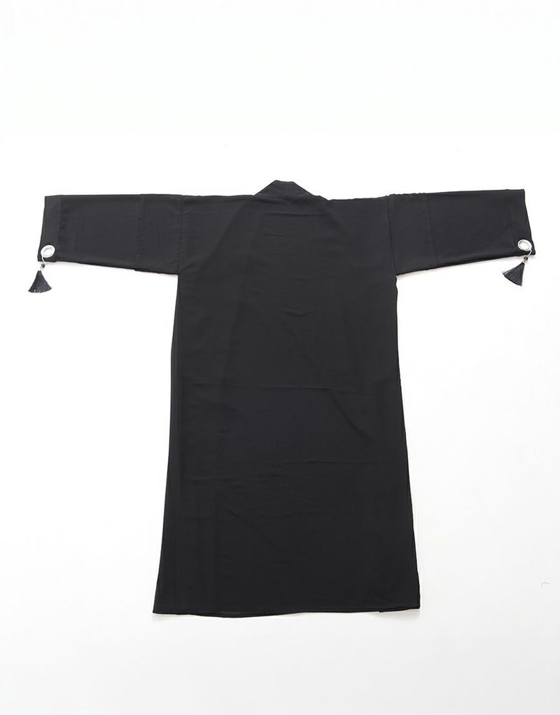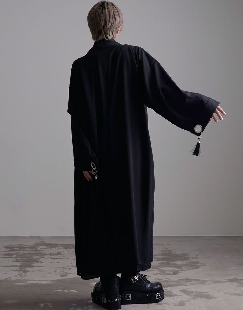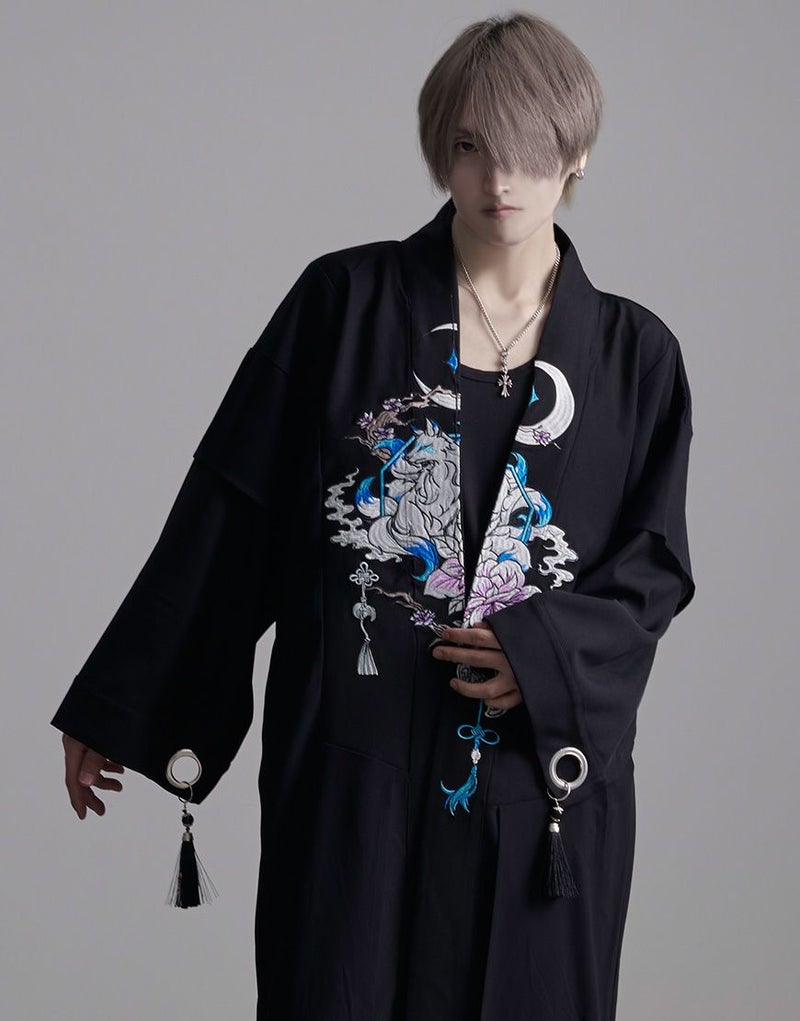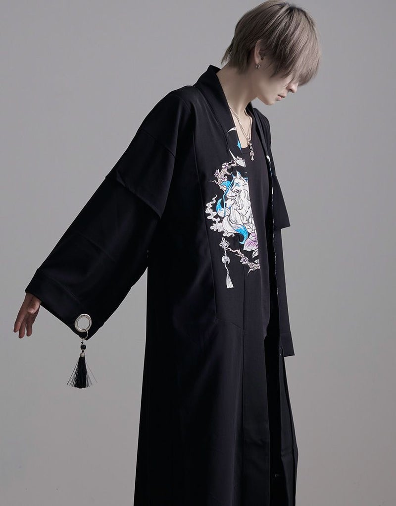 ilililより【月影妖尾】ロング羽織が登場です。 フロントに迫力のある九尾の刺繍が施された和風のロング羽織です。 着物風のシルエットが特徴的で、シフォン生地とのフェイクレイヤードが魅力的です。 袖口には、ハトメにタッセルがあしらわれたデザインが施されています。 和装としてはもちろん、モードなコーディネートにもぴったりな一枚。 高級感のある生地感で仕上げ、 シンプルだからこそ生地や質感に拘りたい方に贈るアイテム。