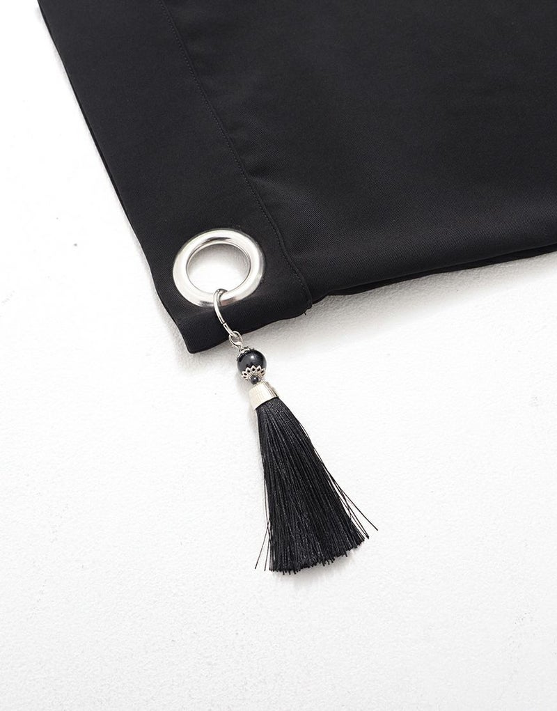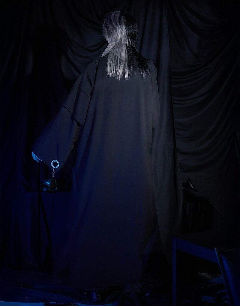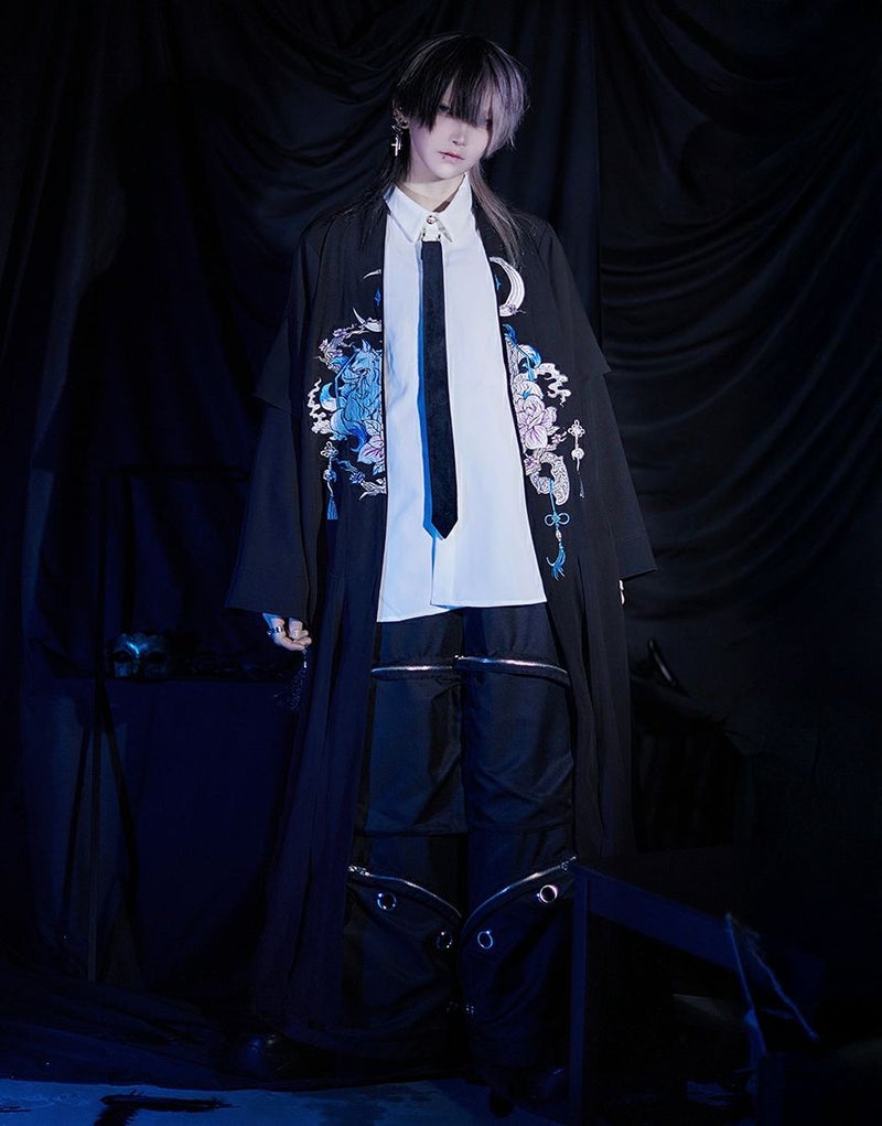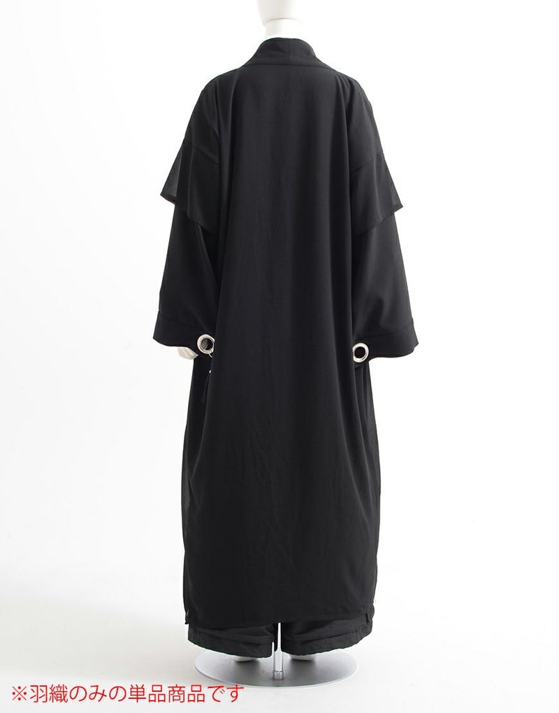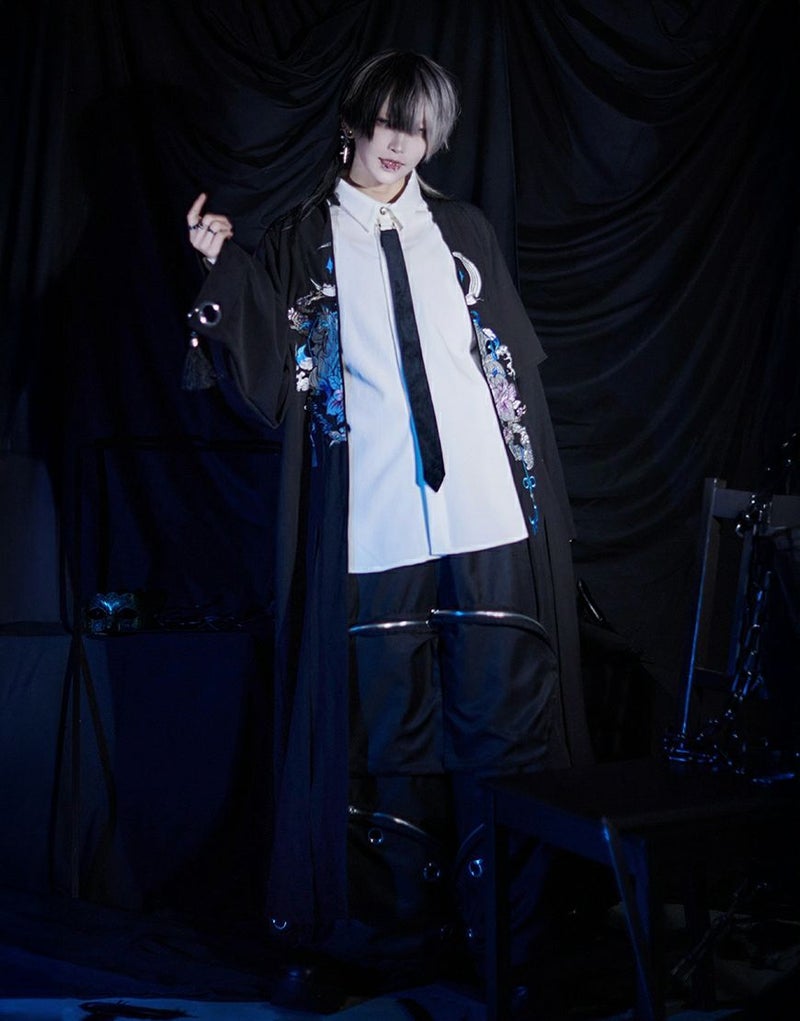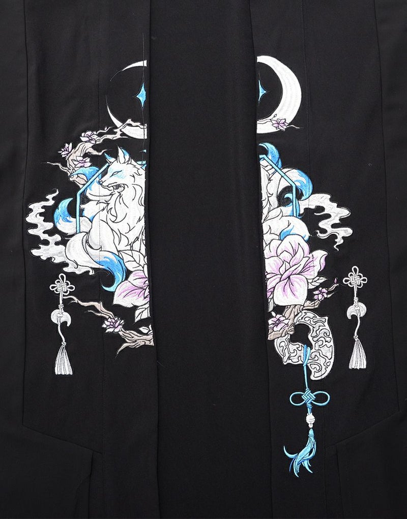 ilililより【月影妖尾】ロング羽織が登場です。 フロントに迫力のある九尾の刺繍が施された和風のロング羽織です。 着物風のシルエットが特徴的で、シフォン生地とのフェイクレイヤードが魅力的です。 袖口には、ハトメにタッセルがあしらわれたデザインが施されています。 和装としてはもちろん、モードなコーディネートにもぴったりな一枚。 高級感のある生地感で仕上げ、 シンプルだからこそ生地や質感に拘りたい方に贈るアイテム。