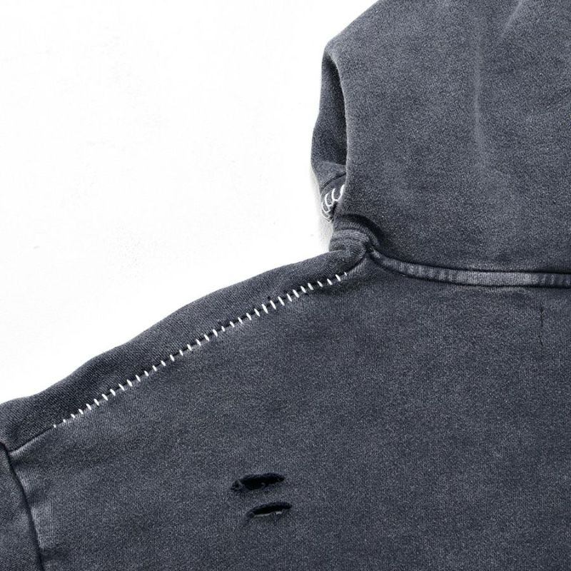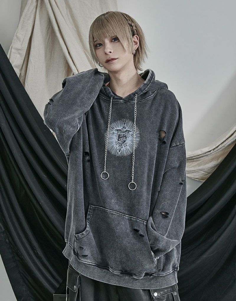 ililil【イルイルイル】よりlost your heartクラッシュ加工パーカーが登場です。 フロントにダガーハートグラフィックがされたプルオーバーパーカー。 所々にダメージ加工を施しヴィンテージ感を演出。ポイントでポケットや袖、フードの配色ステッチデザインと更にドローコードのリングチェーンがアクセントに。 ビッグシルエットでメンズ、レディースを問わず、ユニセックスでご着用頂ける一押しパーカーです。