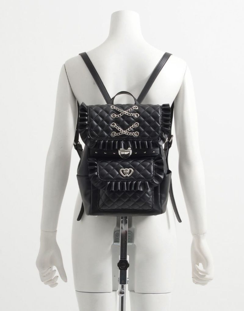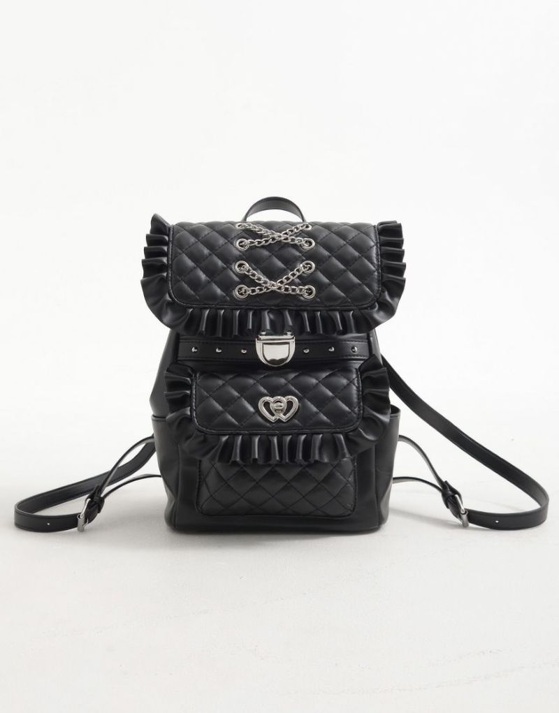 ilililより、地雷ちゃんのまっくろふりるの罪リュックが登場です。 ふりふり、でも毒っぽく。 地雷ちゃんの「かわいい」と「罪」を背負って出かける、真っ黒なごほうび。 広がるフリルとキルティングが印象的なリュック。 フタ部分にはクロスチェーンを、前ポケットにはハートのツイストロックを配し、ディテールの一つひとつに“地雷かわいい”を詰めこみました。 デイリー使いはもちろん、ライブ遠征や推し活にもぴったり◎ 大人でも持ちやすい上品なブラックカラーで、甘すぎないバランス感も魅力です。