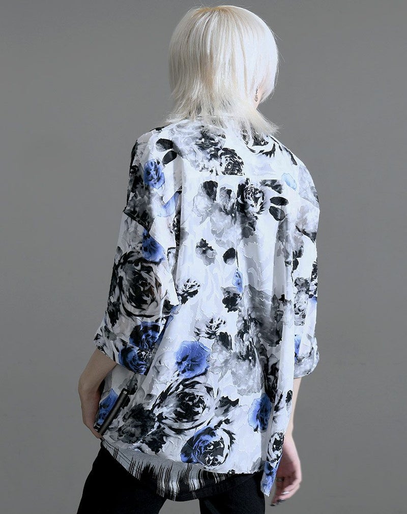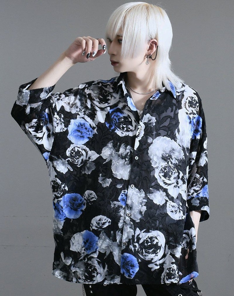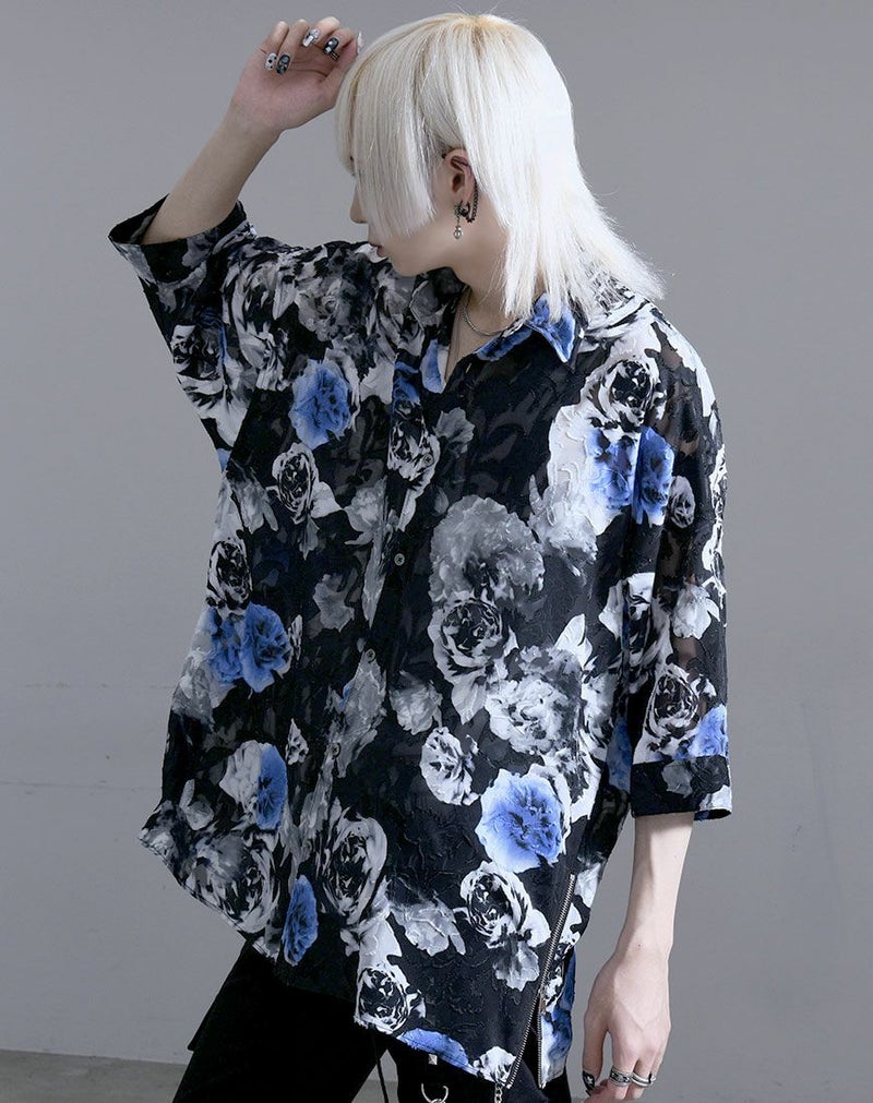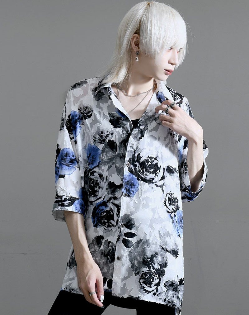ジャガードとシフォンをMIXした様なシースルー素材でデザインされたローズシャツです。