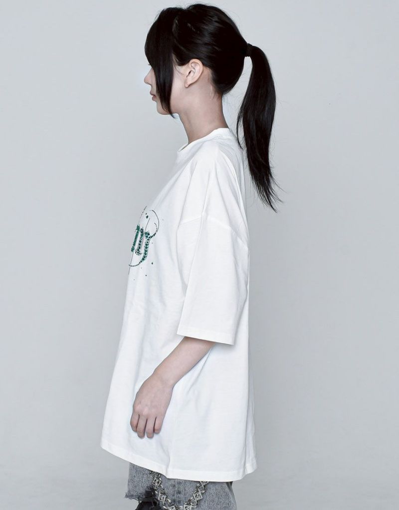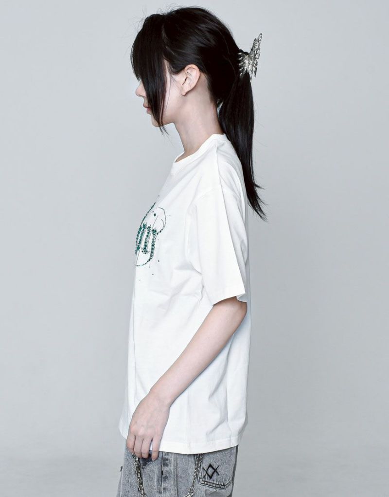 大小さまざまなラインストーンと使用してロゴをデザインの半袖トップスです。