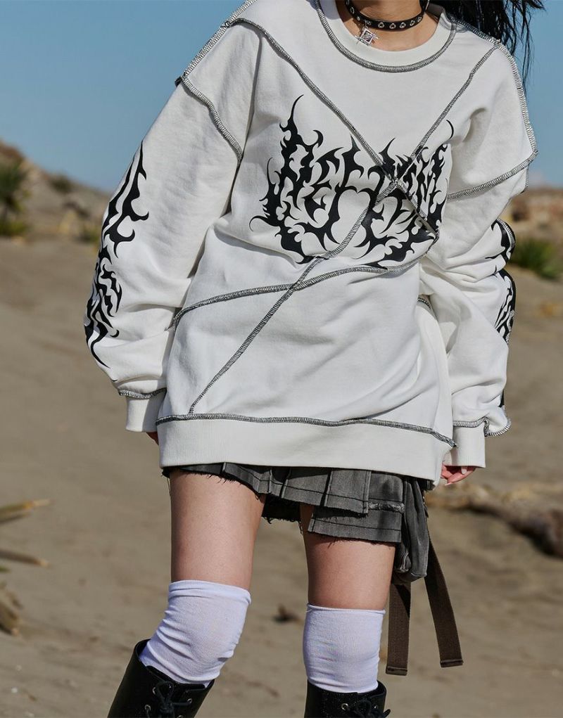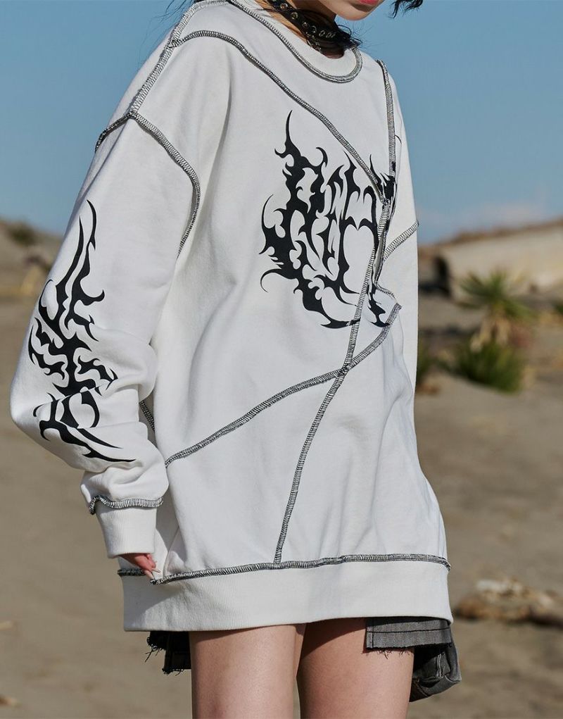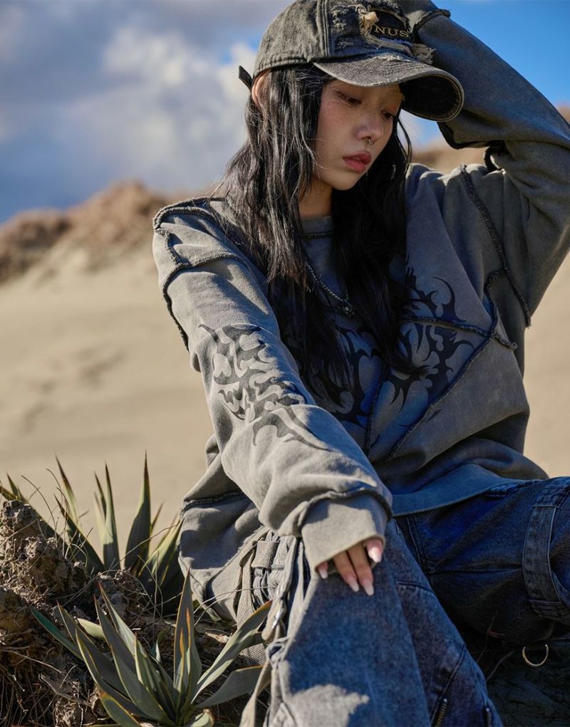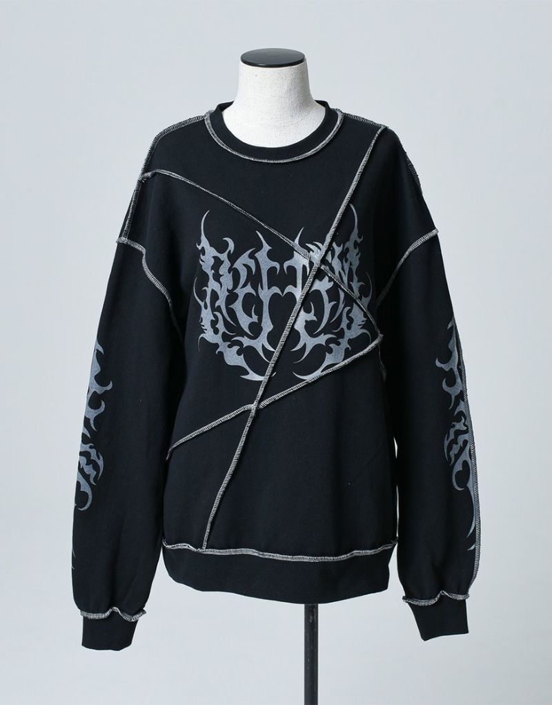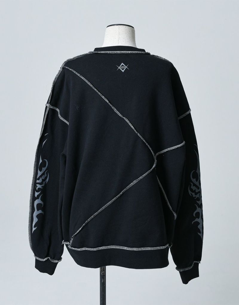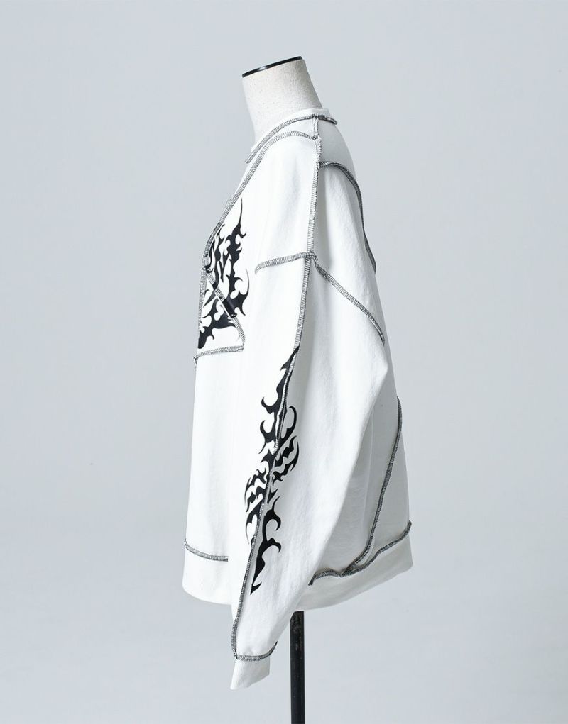 裏毛素材を使用した切り替え仕様のトレーナーでフロント・袖・後衿下にトライバル風のグラフィックプリントを配置。
