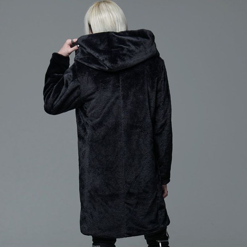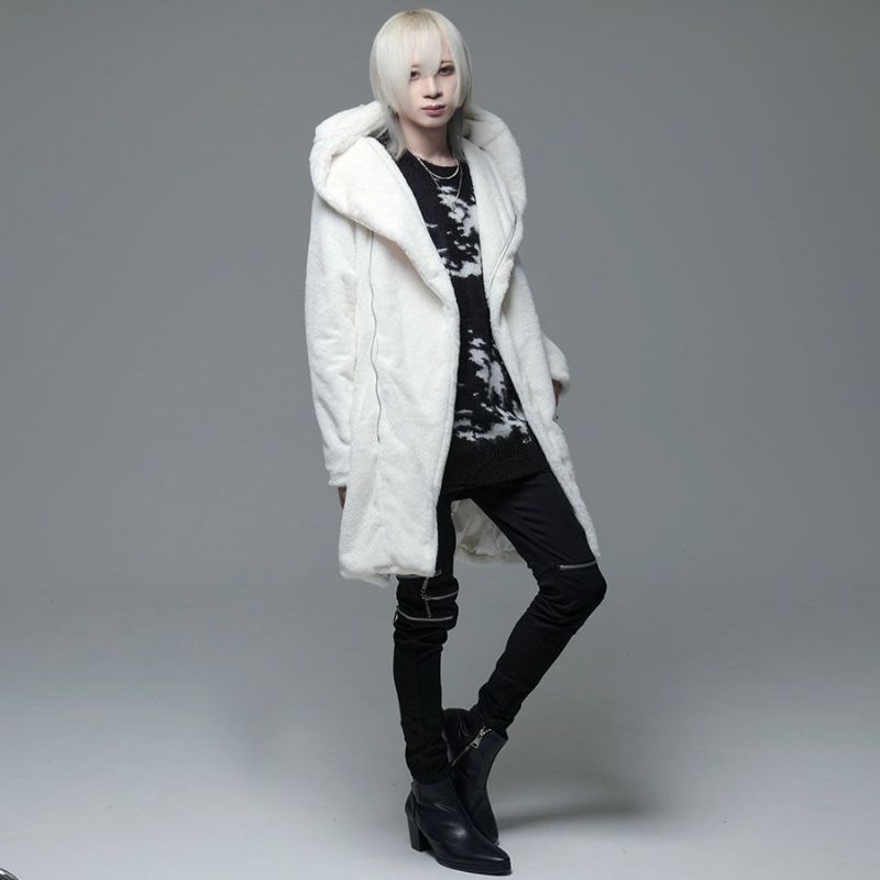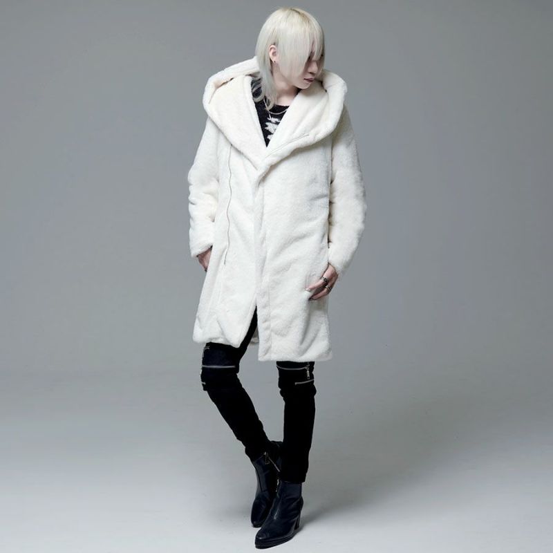 ふわふわモコモコのファー素材を使ったフード付き変形ロングコートです。