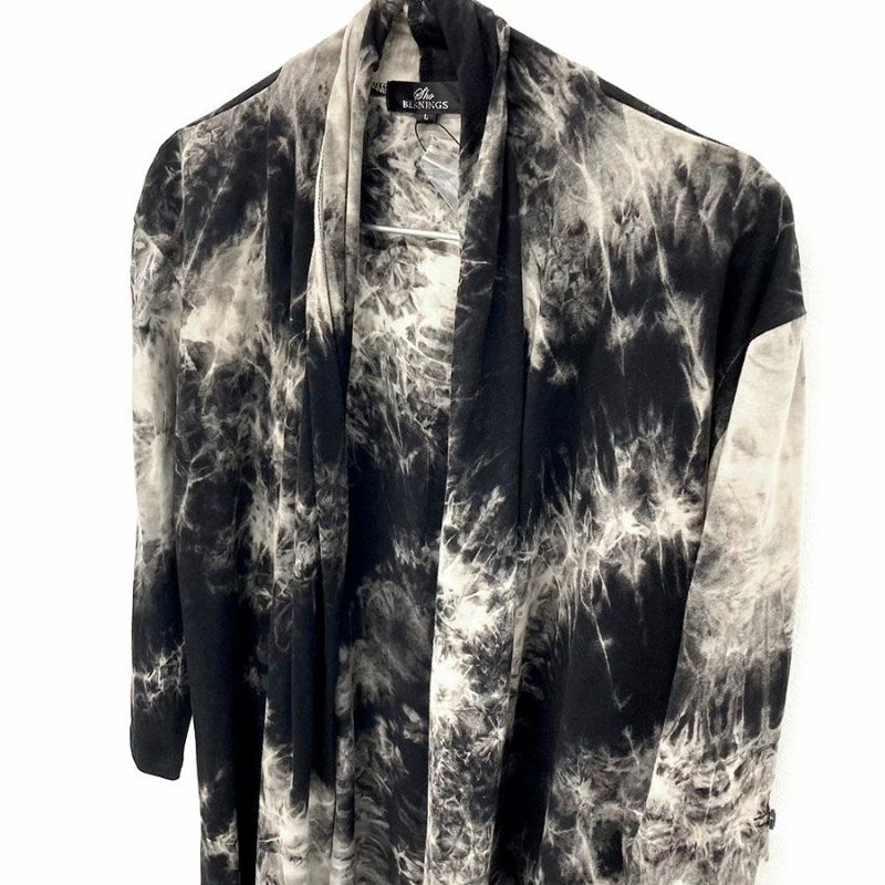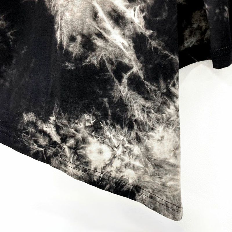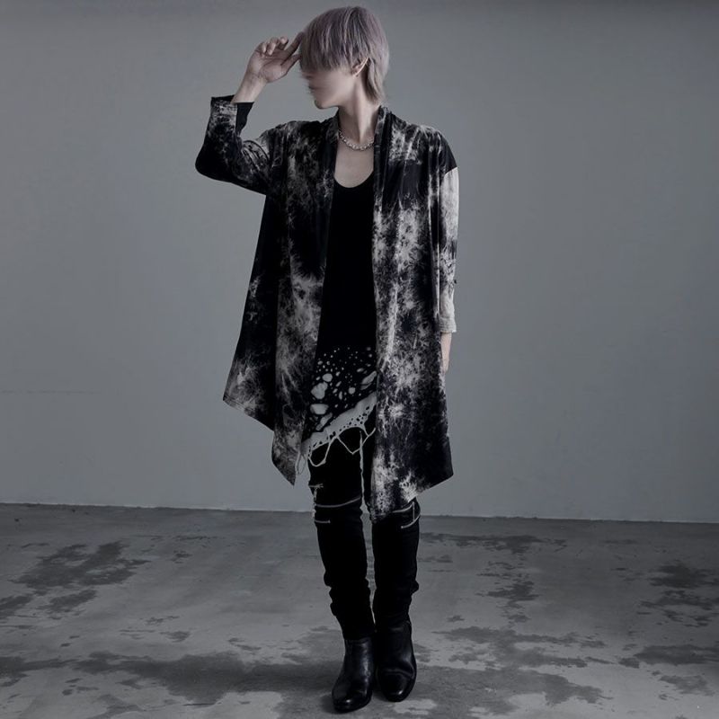 ムラ染めデザインが総柄で描かれたダークな雰囲気のドレープカーディガンです。