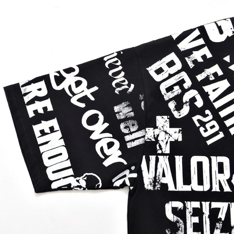 かすれたようなグランジテイストのテキストがフロント、バック全面にプリントされた半袖Tシャツです。