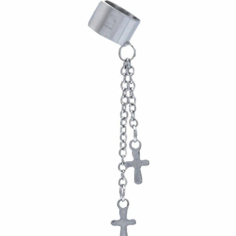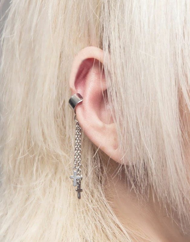 NOVESSELからクロスイヤーカフが登場しました。 シンプルで合わせやすい小ぶりな十字架を2つ垂らしたイヤーカフです。 ゴシック服、ゴスロリやパンク・V系・原宿系に相性抜群のワンポイントアクセとなっています。 ※モデル画像は照明などの影響により実際の商品と異なる場合がございます。