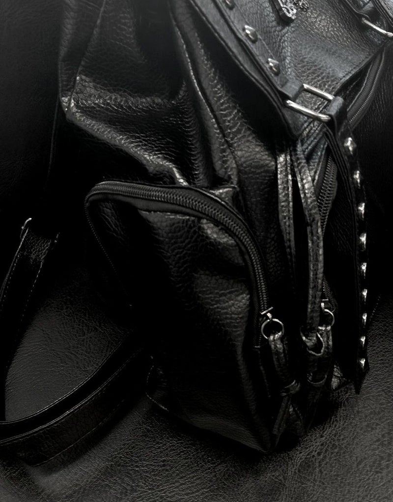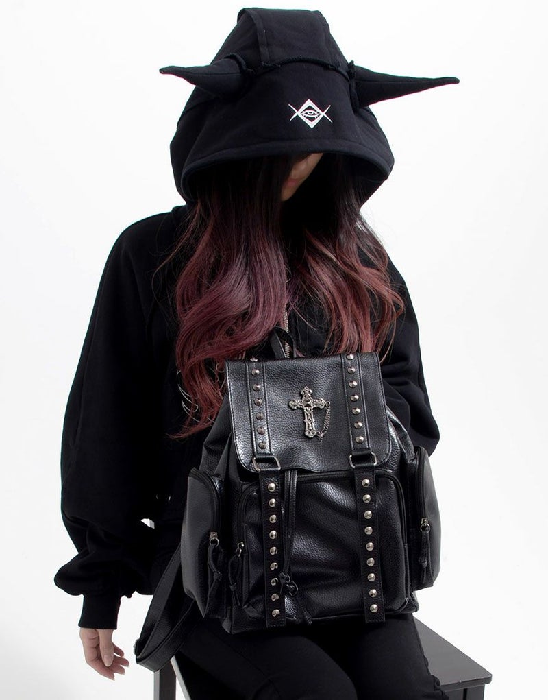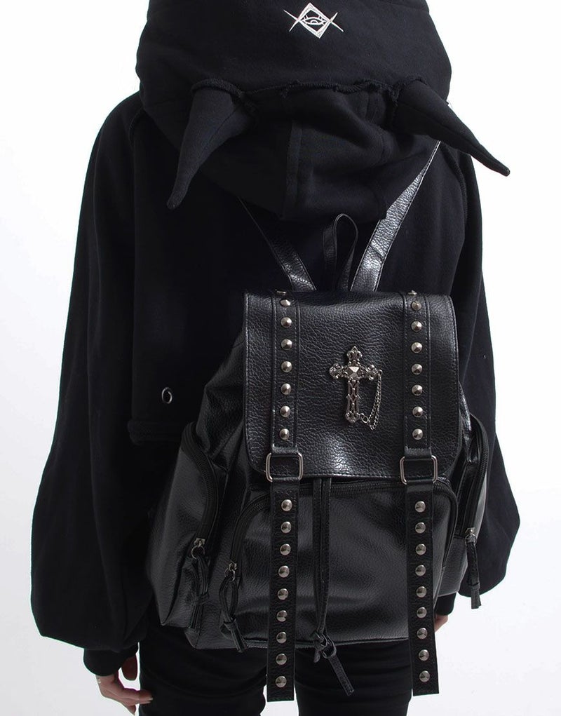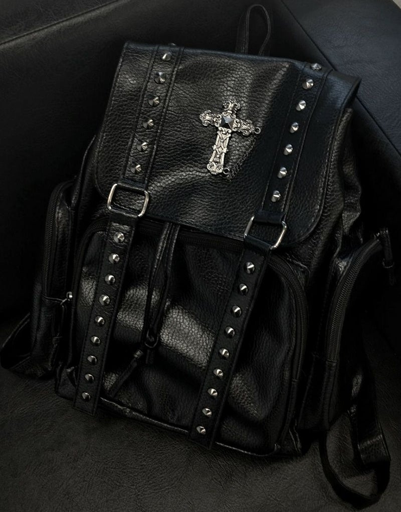 フラップ部分にチェーン付きのクロスチャームが配置され、スタッズ付きのデザインベルトが存在感抜群のリュック。