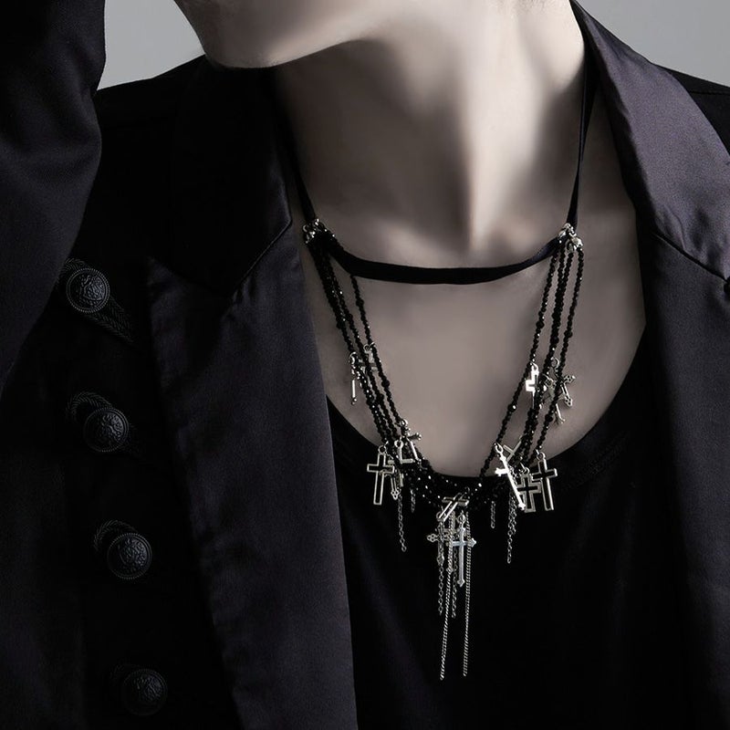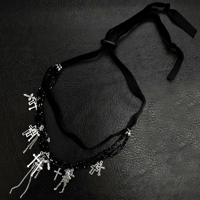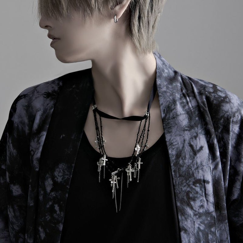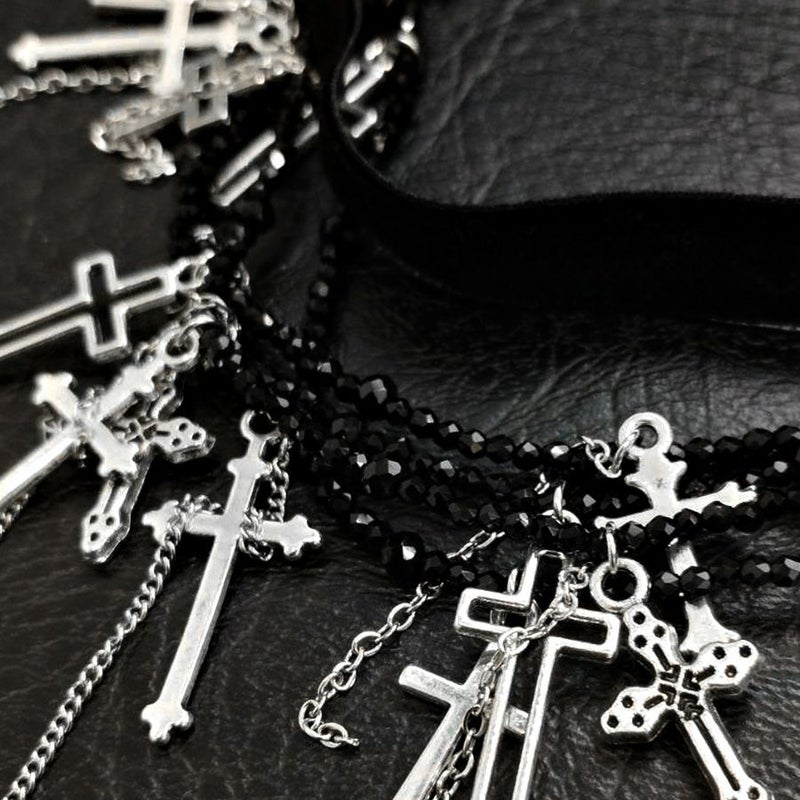 NOVESSEL【ノベセル】メニークロス多連チョーカーが登場。 たくさんのデザインが異なるクロスを散りばめた多面カットビーズとリボンが連なっ多連チョーカー。 闇カワ、パンク、ロック系のスタイリングは勿論、ストリートスタイルのアクセントにもおすすめ◎ ユニセックスとしても着用可能ですので、是非お試しください! ※モデル画像は照明などの影響により実際の商品と異なる場合がございます。