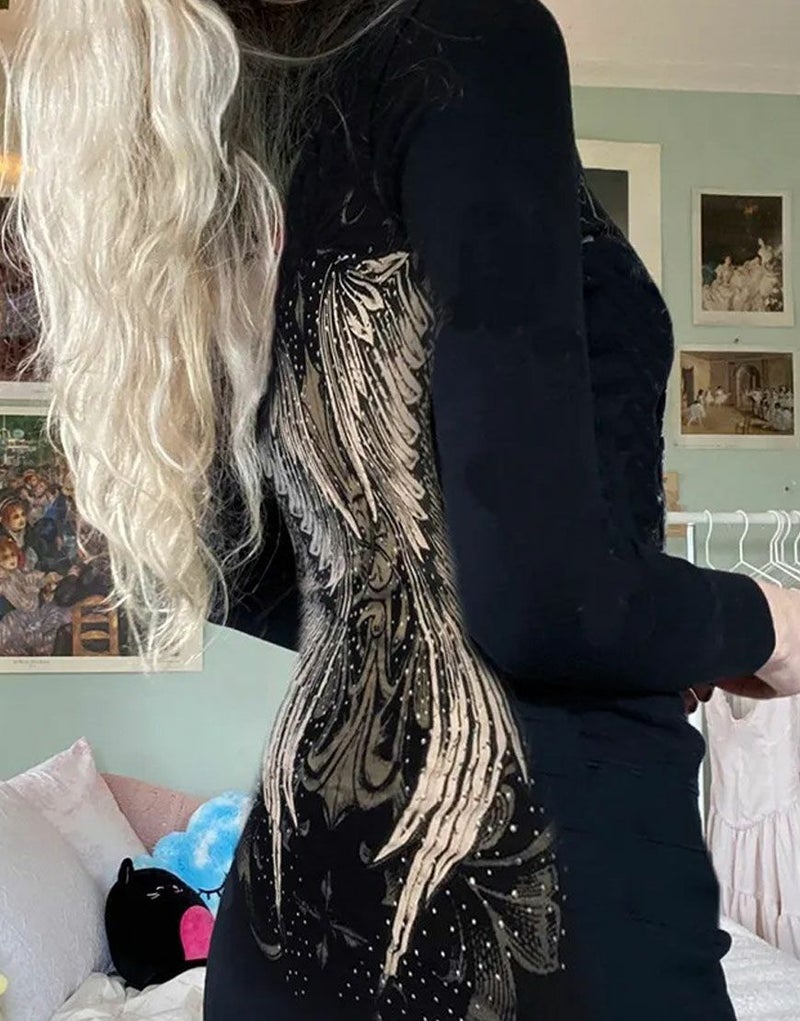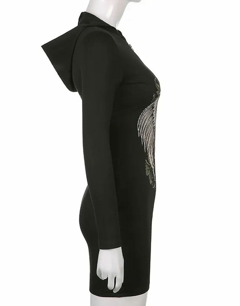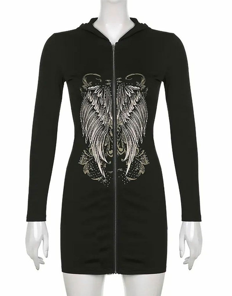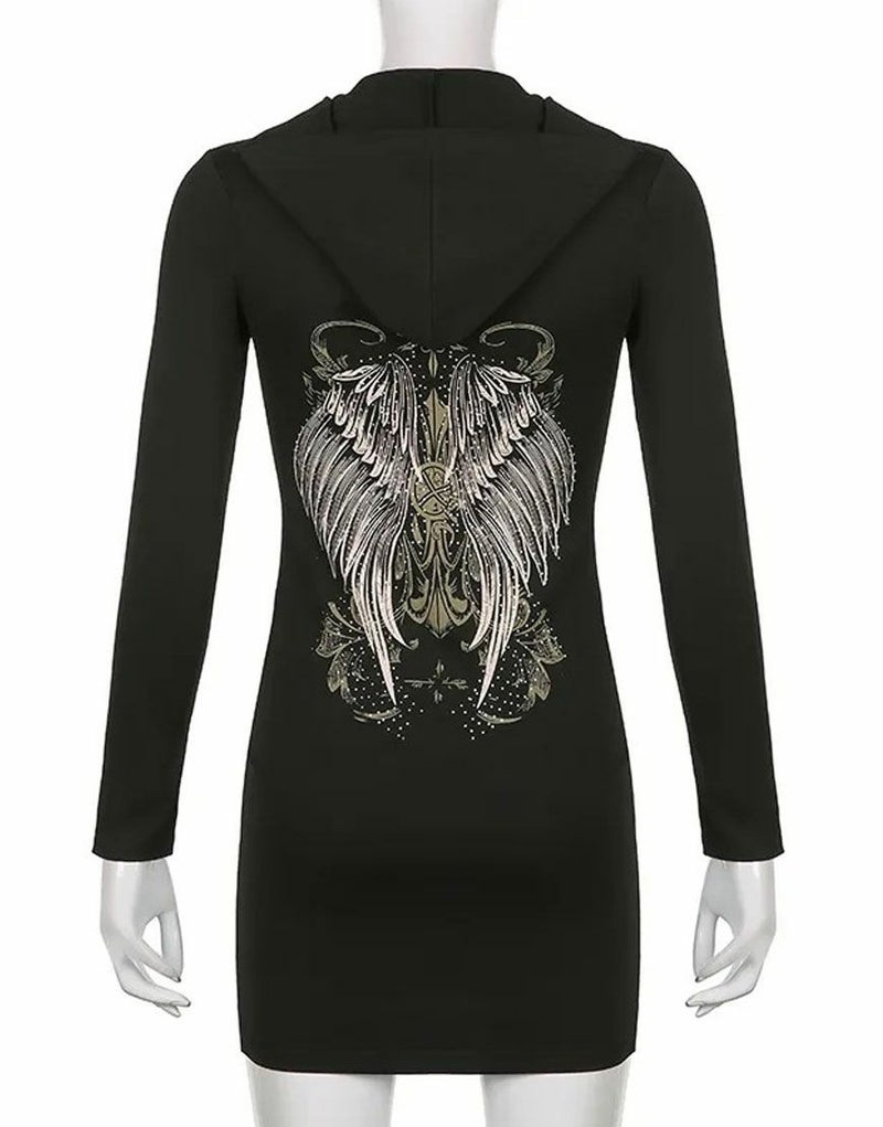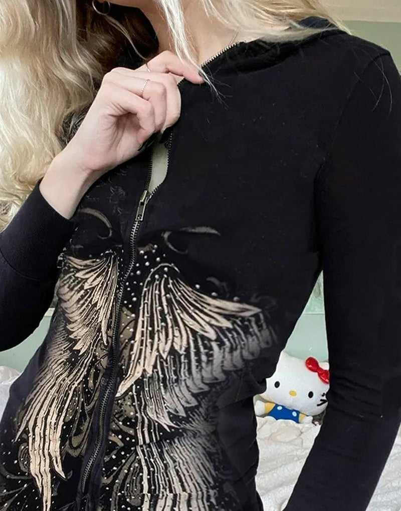 NOVESSEL【ノベセル】からフード付きプリントジップアップ長袖カットソーが入荷しました。 Tシャツ生地にフード付きの細身シルエットのカットパーカー。 カットワンピースデザインとインパクトある前後のプリントがギャルっぽいテイストにも合わせやすい一品です。 アクセや髪色とマッチさせて、派手めなY2Kスタイルを楽しめます。