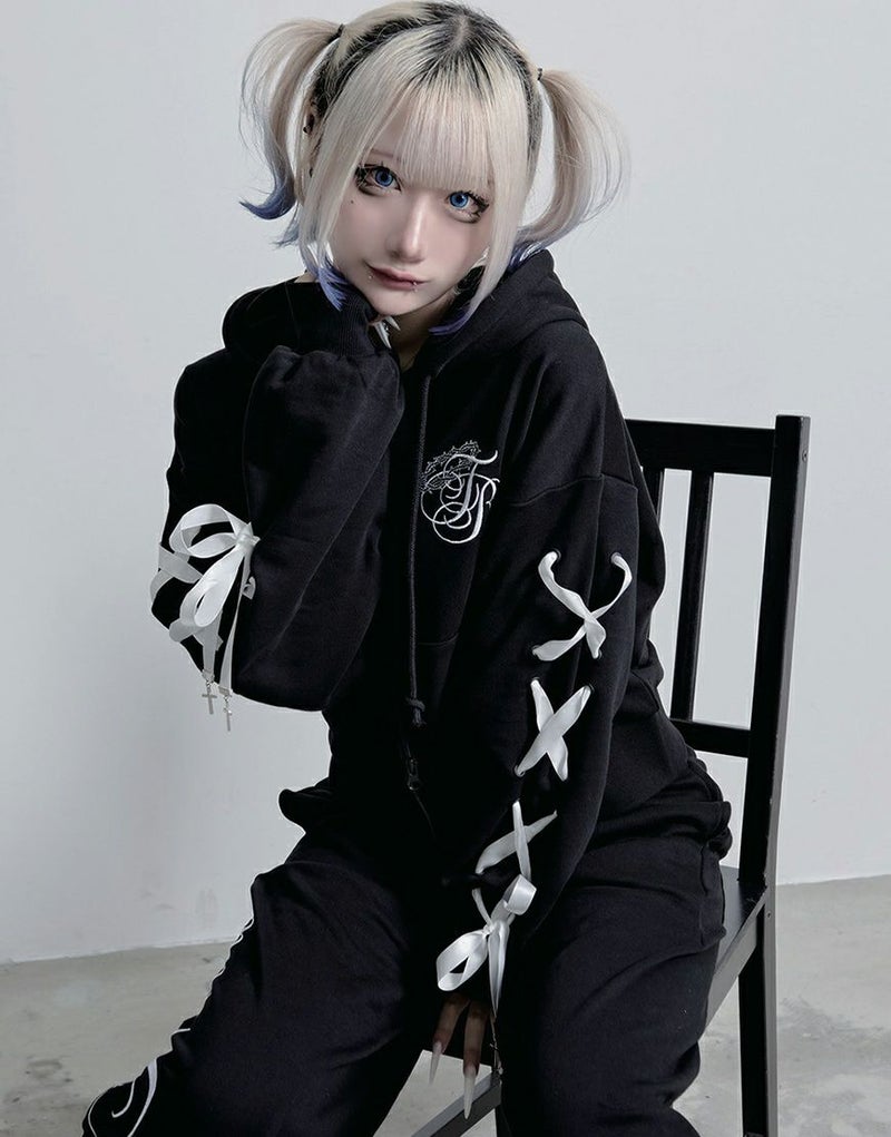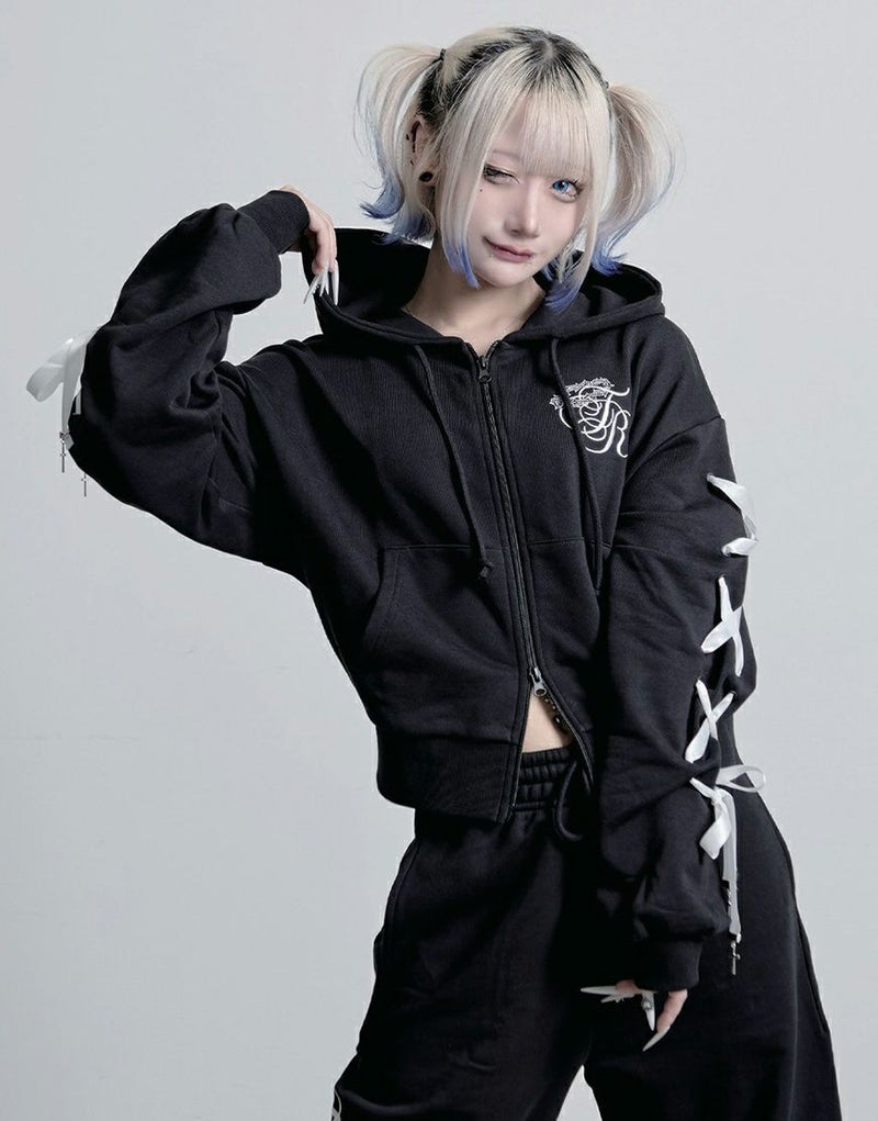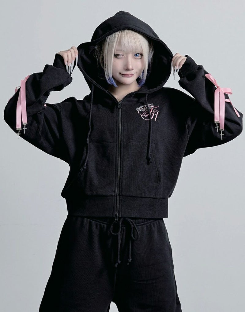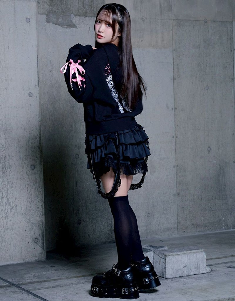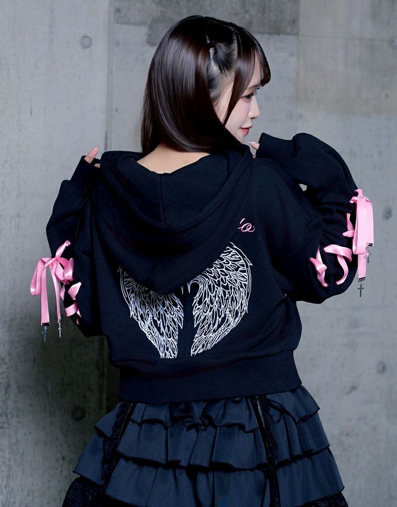 袖に走るレースアップリボンは、先端に“十字架チャーム”をあしらい、ゆらゆら揺れるたびに可愛さと毒っぽさが共存するアクセントに。