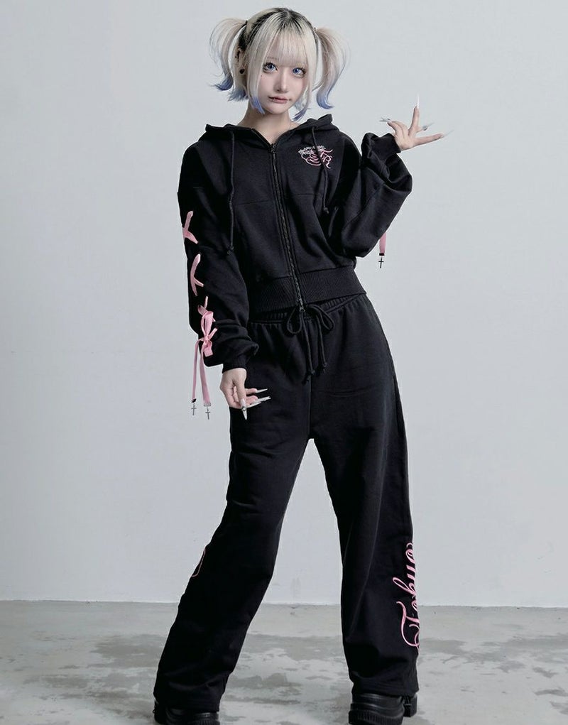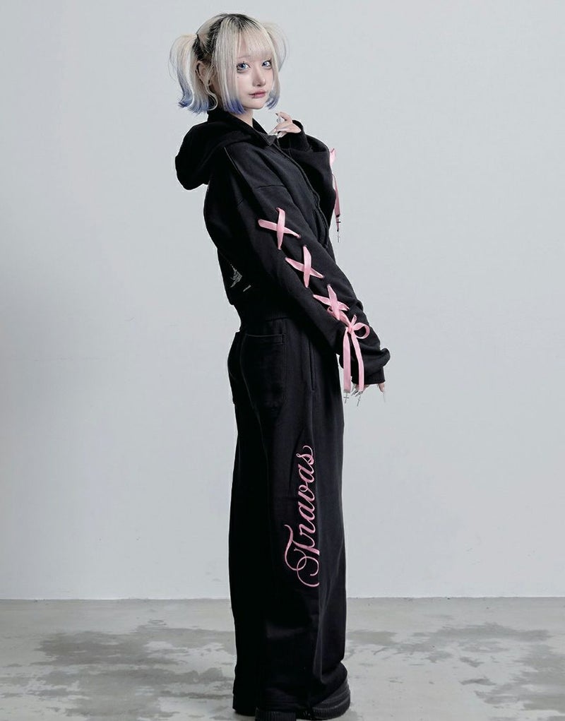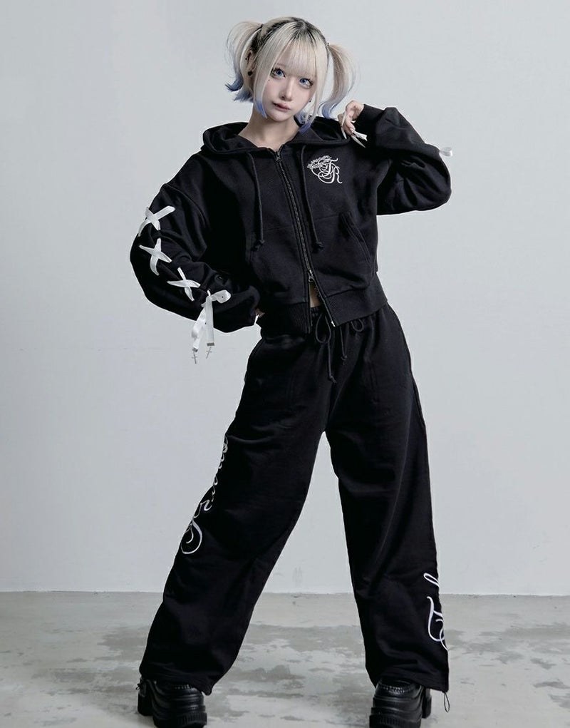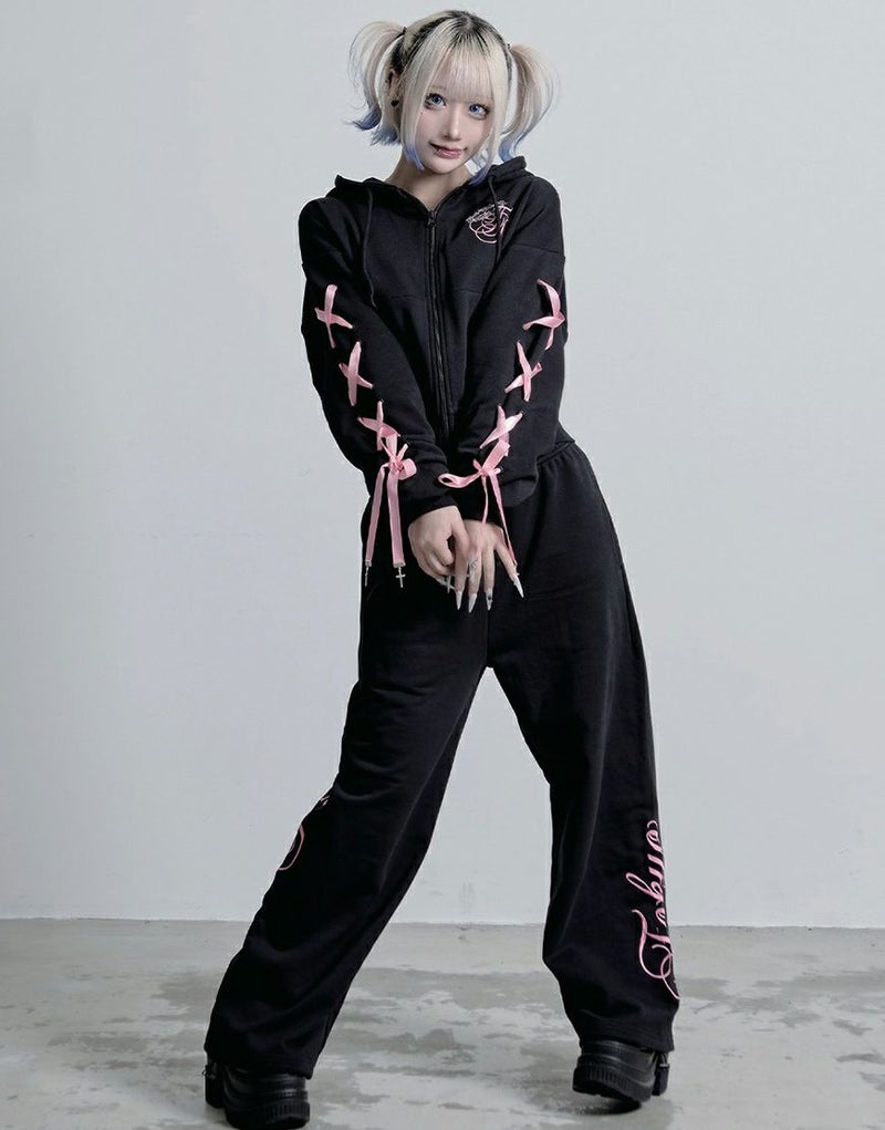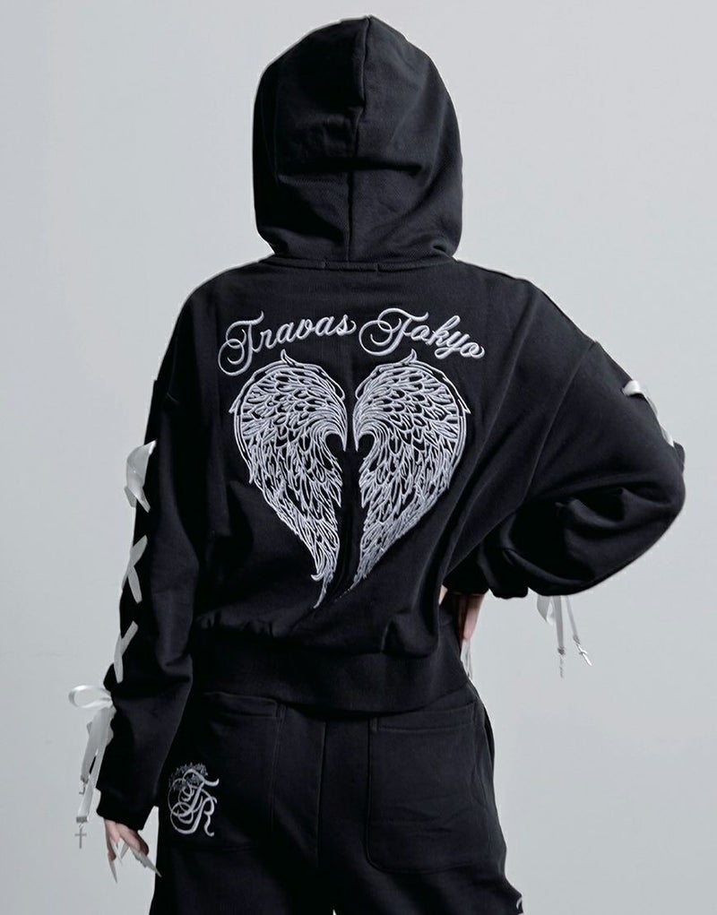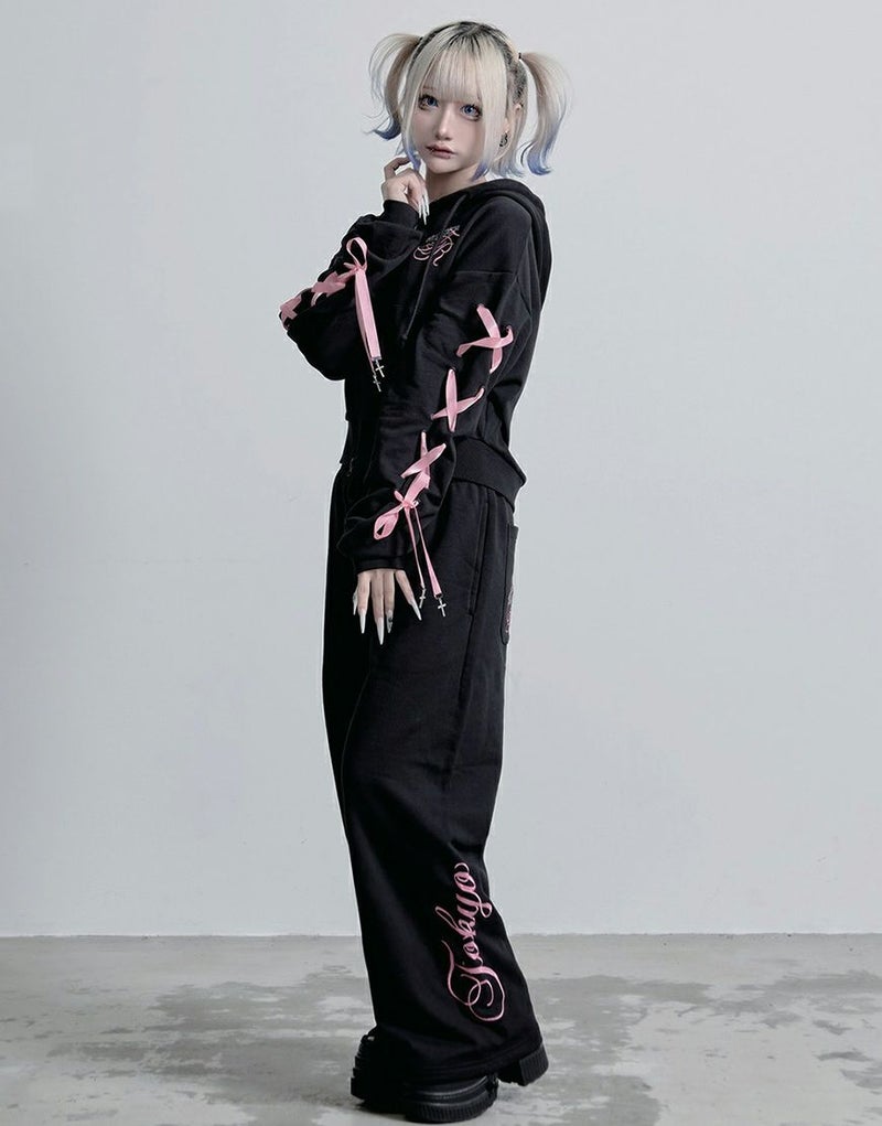 袖に走るレースアップリボンは、先端に“十字架チャーム”をあしらい、ゆらゆら揺れるたびに可愛さと毒っぽさが共存するアクセントに。