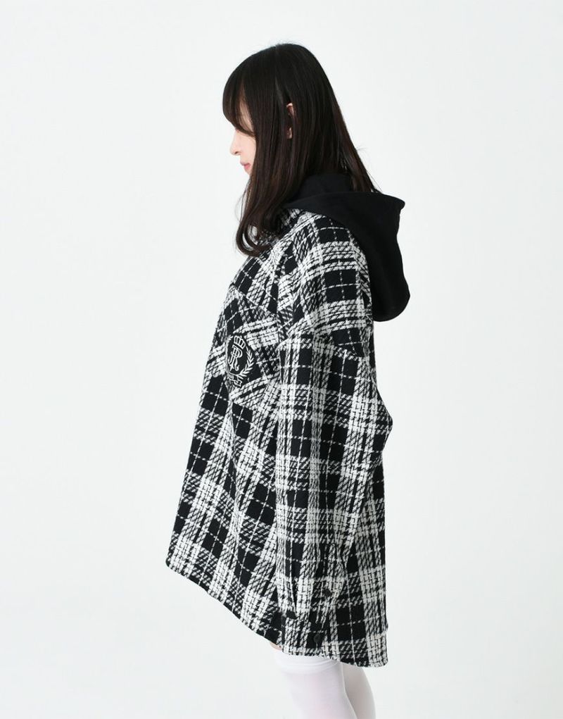厚手のチェック生地を使用。スウェット生地のフード部分はボタンで脱着可能です。