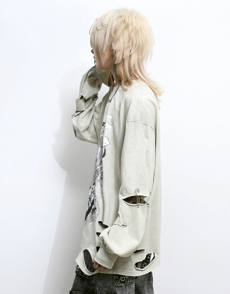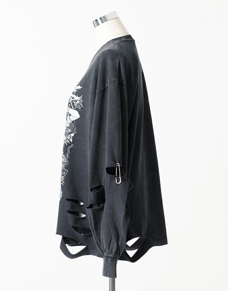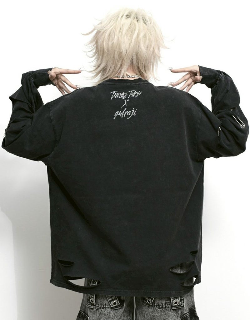 両袖と前後身頃の裾部分にはカットダメージ加工を施し、無骨でラフな雰囲気をプラス。