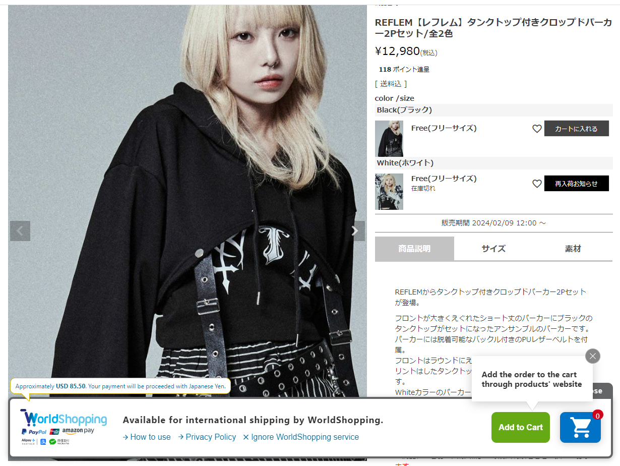 1.当您从日本以外的国家/地区访问网站时,在页面底部会自动显示“WorldShopping Cart“(WorldShopping的购物车图标)。
